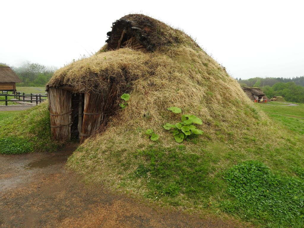 竪穴式住居。これは土葺きの再現。他に茅葺き、樹皮葺きなどがありました。