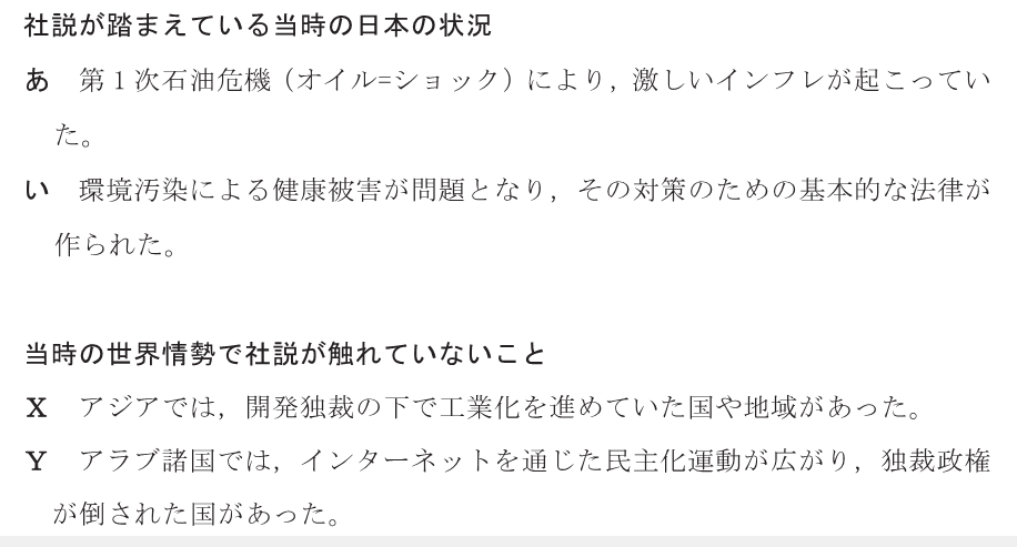 授業で冷戦と国際関係を焦点化したからといって、この設問が求める「オイルショック」「公害対策基本法」「開発独裁」「アラブの春」の正確な年代や内容は推理できません(「公害やオイルショックは日本人の常識」は昭和生まれの思い込み)。