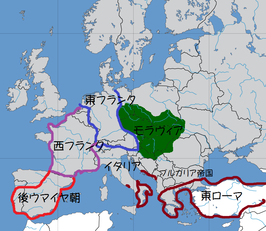 タンクレッドさん作成のモラヴィア王国最大領土の地図(パブリックドメイン)にぶんぶんが近くの王国を書き込んだもの