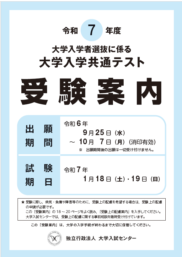 2024年7月10日、大学入学センターのHPに2025(令和7)年度の大学入学共通テスト(以下共通テスト)の受験案内がアップされました。